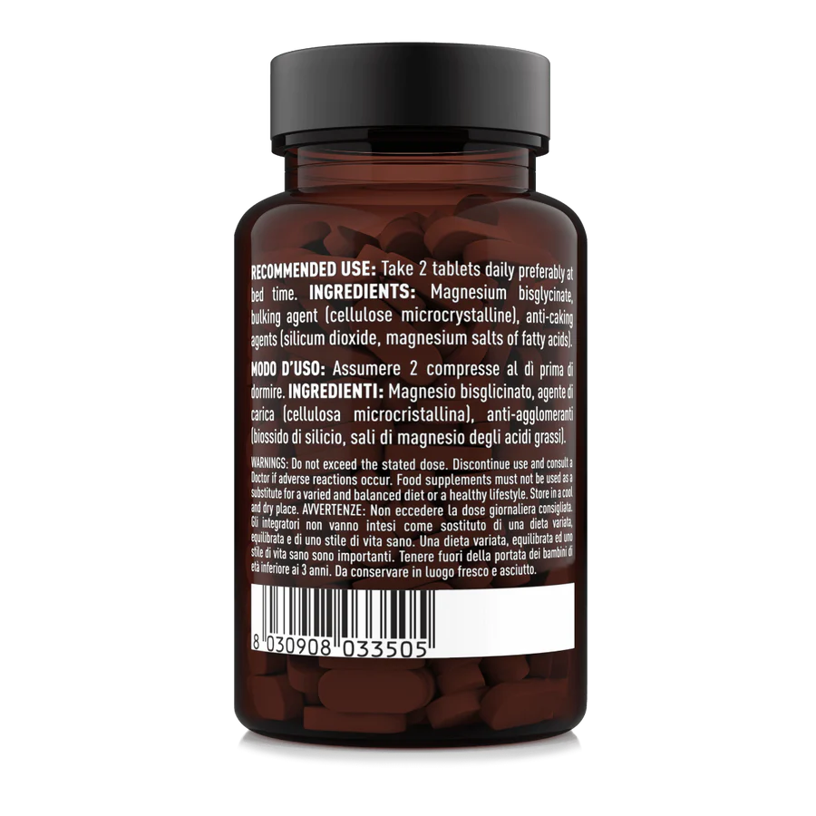 Integratore alimentare di puro Magnesio Bisglicinato in compresse. Questa forma di magnesio, detta chelata, lo rende il perfetto alleato per il rilassamento muscolare e del sistema nervoso.