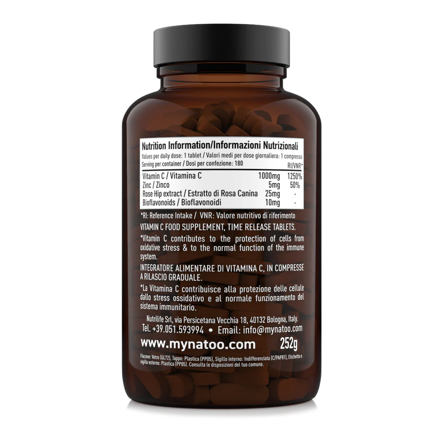 Integratore di Vitamina C 1000mg a rilascio graduale Nätoo, con zinco, rosa canina e bioflavonoidi. Sostiene le difese immunitarie, riduce stanchezza e stress ossidativo per un benessere costante durante tutta la giornata.