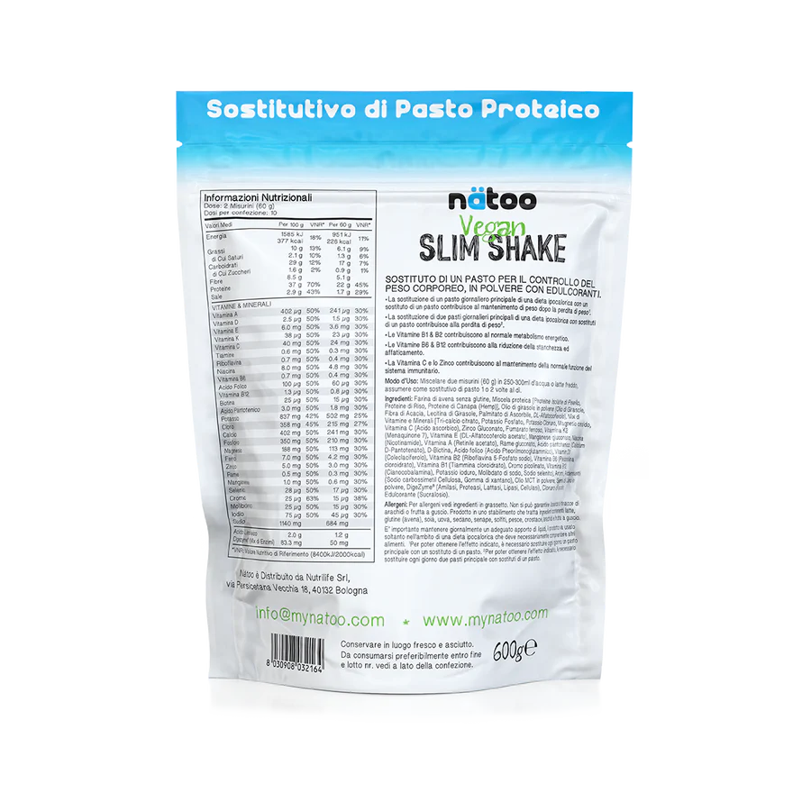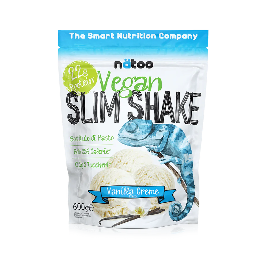 Vegan Slim Shake Nätoo è un pasto sostitutivo delizioso e nutriente, con soli 230 kcal per porzione. Fornisce una combinazione equilibrata di 27 vitamine e minerali essenziali, mentre gli enzimi digestivi ne assicurano un’assimilazione ottimale.