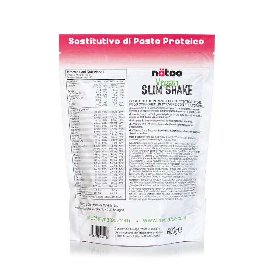 NATOO SLIM SHAKE è potenziato con 27 vitamine e minerali e con una precisa combinazione di enzimi digestivi, il tutto in uno squisito shake con sole 224-230 calorie. Formulato con proteine vegetali ad alto valore biologico, grassi sani, fibre, enzimi digestivi e carboidrati da avena gluten free. Sviluppato per contribuire al controllo del peso corporeo o per supportare le prestazioni del vostro corpo.
